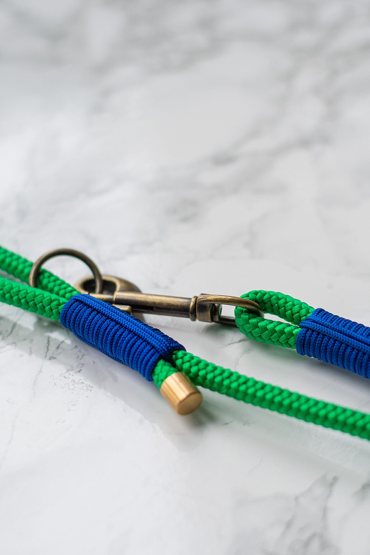 This luxurious dog leash is the perfect fit for you and your beloved dog! The leash is made from strong, Metallic Green paracord with Electric Blue accents and brass hardware. The total length is 120cm.