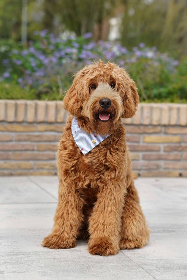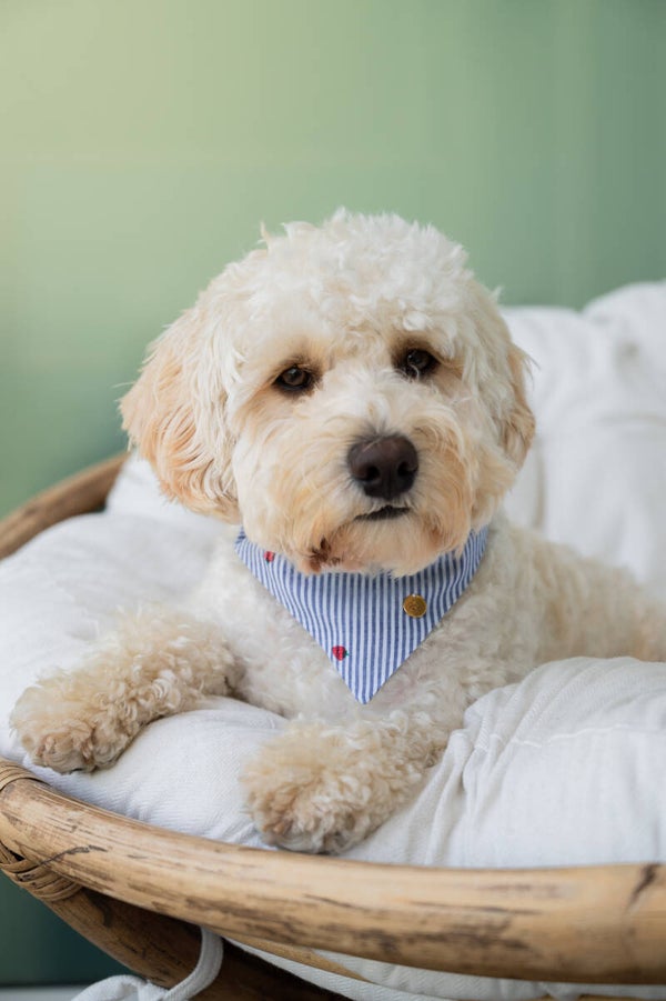 The bandanas are 100% cotton and are available in three sizes: XS, S and M. The badanas slide over your dog’s collar for an easy fit.