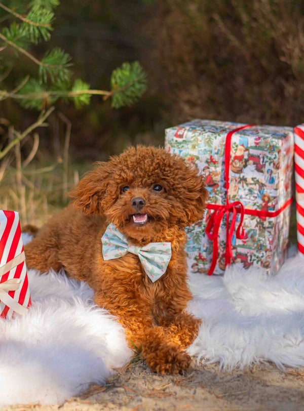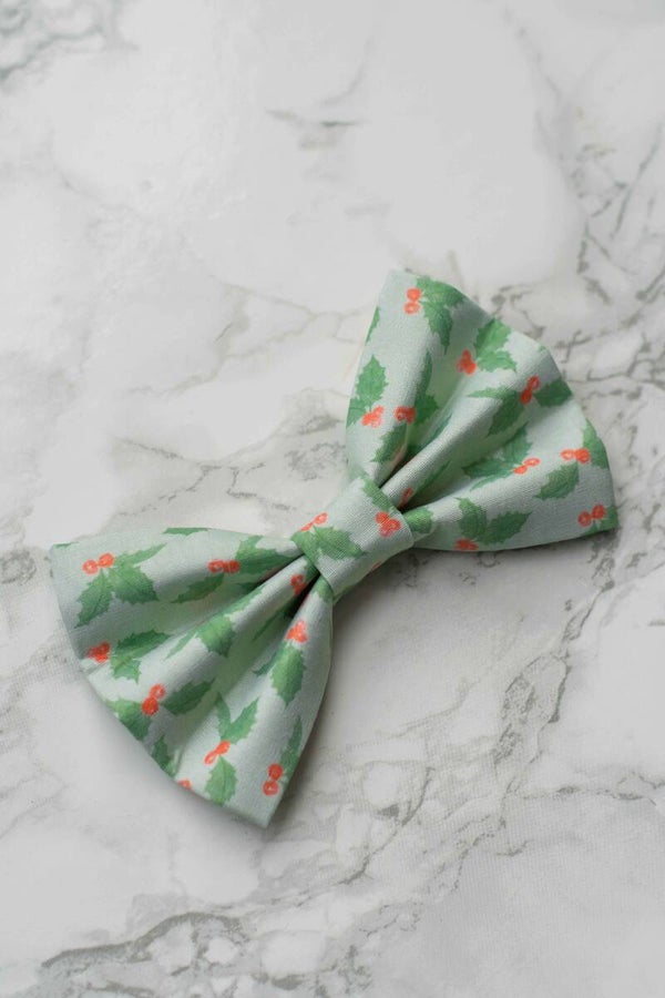Ho Ho Bow! These cute bows will make your dogs look even more jolly! They are handmade with 100% cotton and come in many fun and colorful designs. You can slide the bows onto your collar with the elastic bands on the backside of the bow.