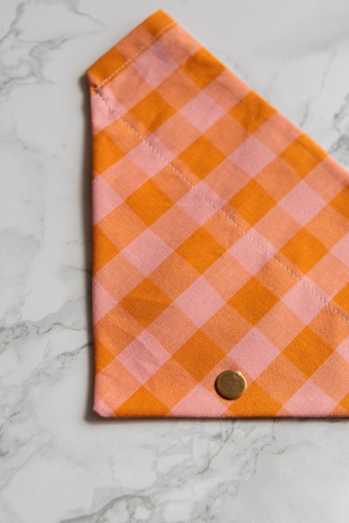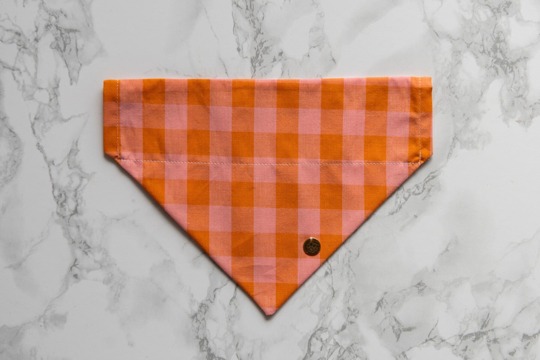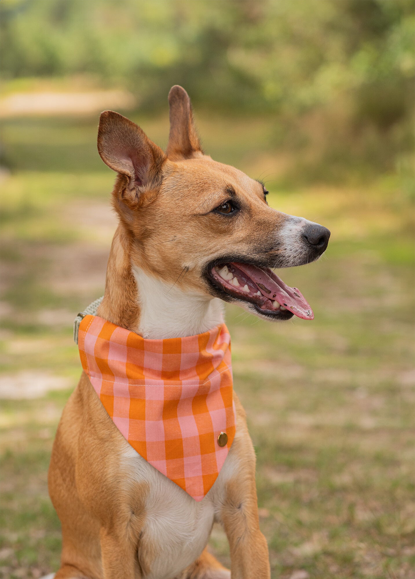 Featuring a cheerful pink-orange gingham print, this bandana is made for sun-soaked strolls and picnic playdates. It’s fruity, flirty, and fun just like your pup.